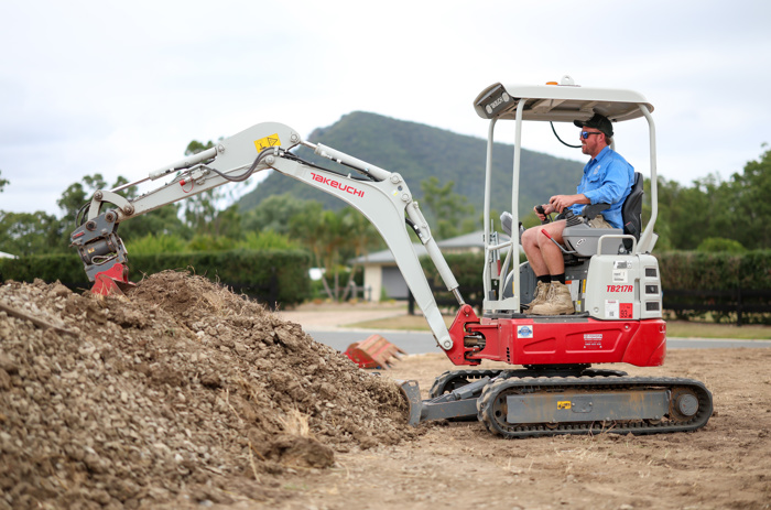 The Takeuchi is used primarily for short-term hire purposes by other businesses and tradespeople, clearing and levelling earth to make room for storage tanks, tiling and landscaping.
