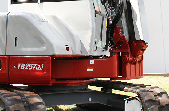 The newest mini excavator in the FR platform, the TB257 FR mini excavator features a side-to-side (STS) offset boom combined with minimal tail swing for unmatched visibility to the work equipment and enables it to rotate fully with very little overhang. Its low center of gravity and optimised counterweight placement creates an extremely stable platform with lifting capabilities similar to that of a conventional machine.