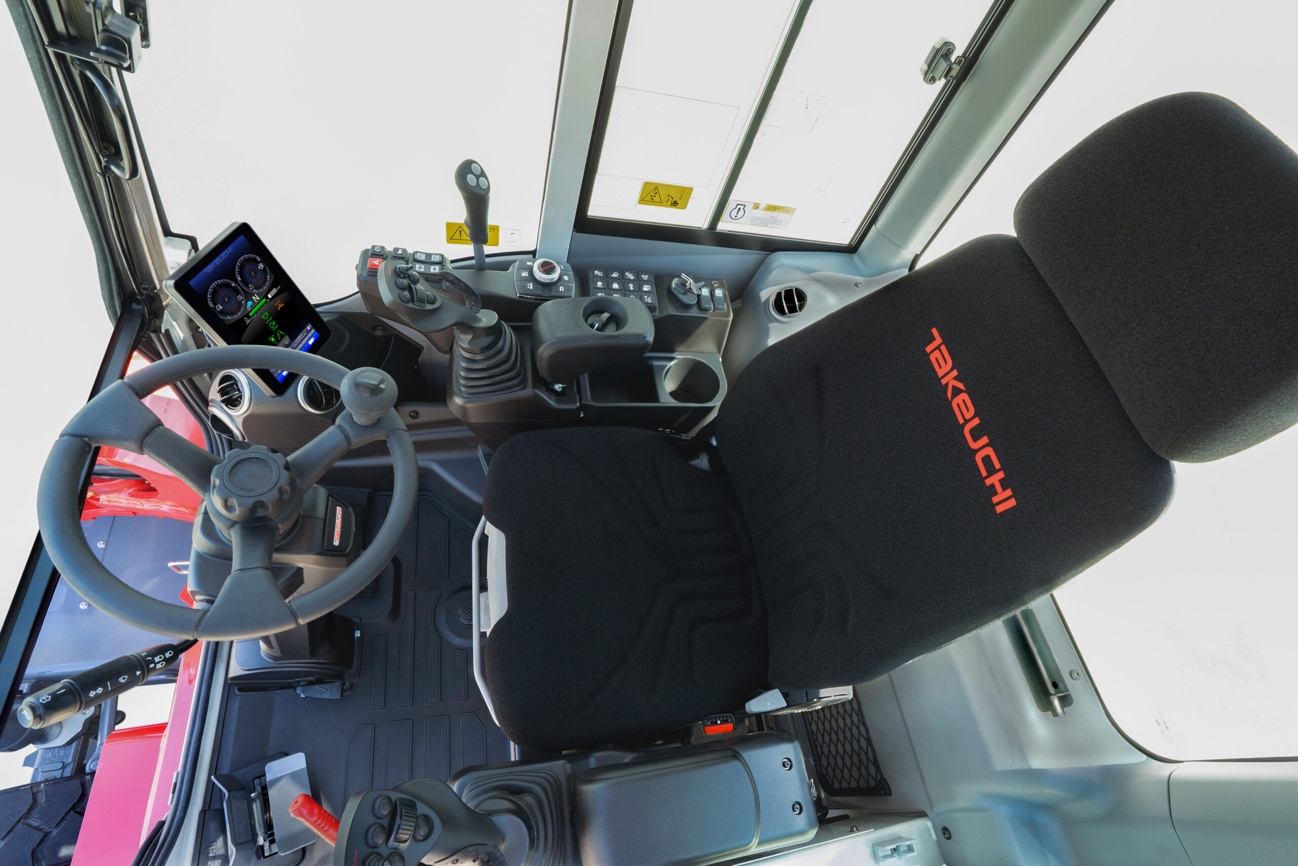 Automotive Styled Interior – Embodies Takeuchi design principal of exceptional operator comfort. The cabin interior size is very spacious for its class and provides unmatched comfort and visibility.