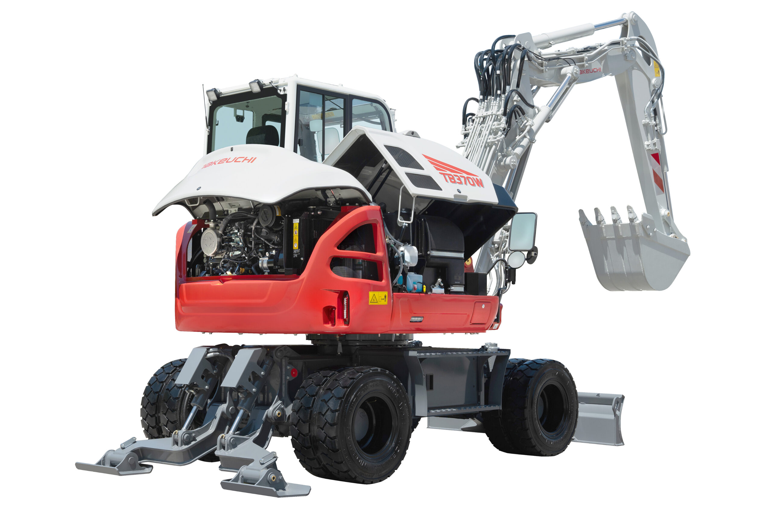 The TB370W wheeled excavator provides owner/operators with a highly versatile option that combines powerful excavating performance with on-road capabilities, making it ideal for shorter-term, faster-paced projects. With all the unique benefits of a wheeled unit, including higher travel speeds and the auto cruise control which enables operators to set and adjust their travel speeds by pressing a button or operating toggle switch (equipped on optional multi function grips), TB370W features a wider operating range with a 2-piece variable angle boom, precise hydraulic operations using load sensing hydraulic system and up to four auxiliary hydraulic circuits for improved productivity. In addition, an operator can select their preferred working mode among three options, standard, ECO and ECO plus. ECO plus mode automatically changes the working mode between standard and ECO depending on its load for the best efficiency and ECO friendly.